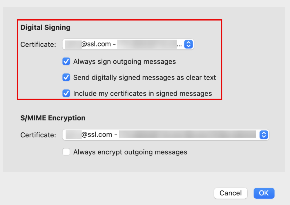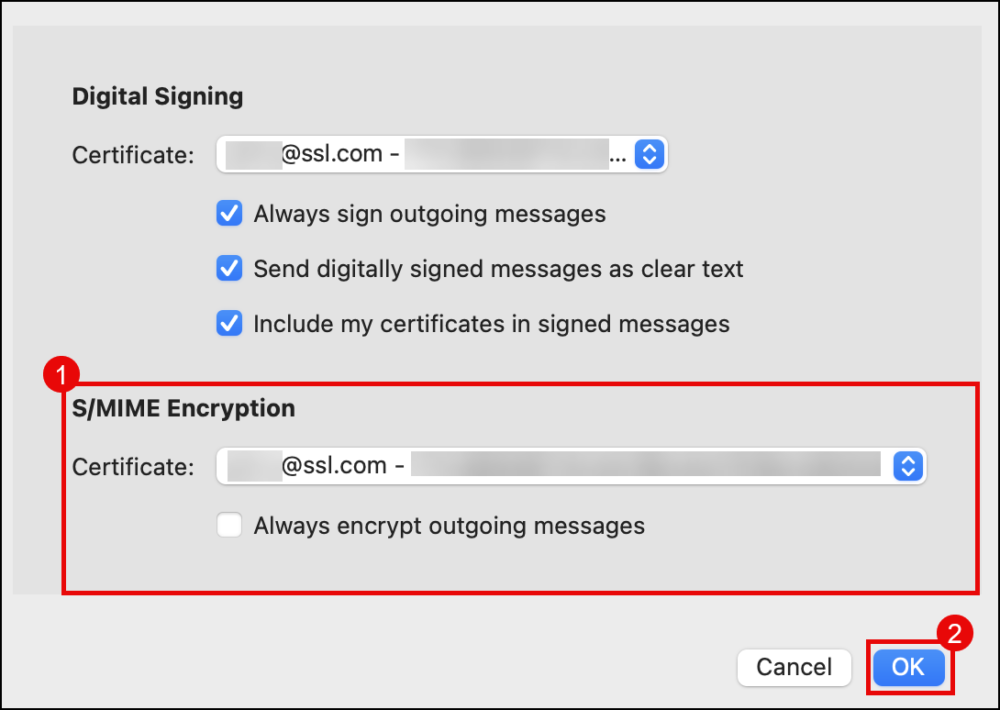 4. Under S/MIME Encryption, choose the S/MIME certificate you want to use to encrypt the contents of your email. Since an encrypted message can only be sent to someone if you possess their public key, it’s more practical to leave this unchecked. Click the OK button after configuring your options.