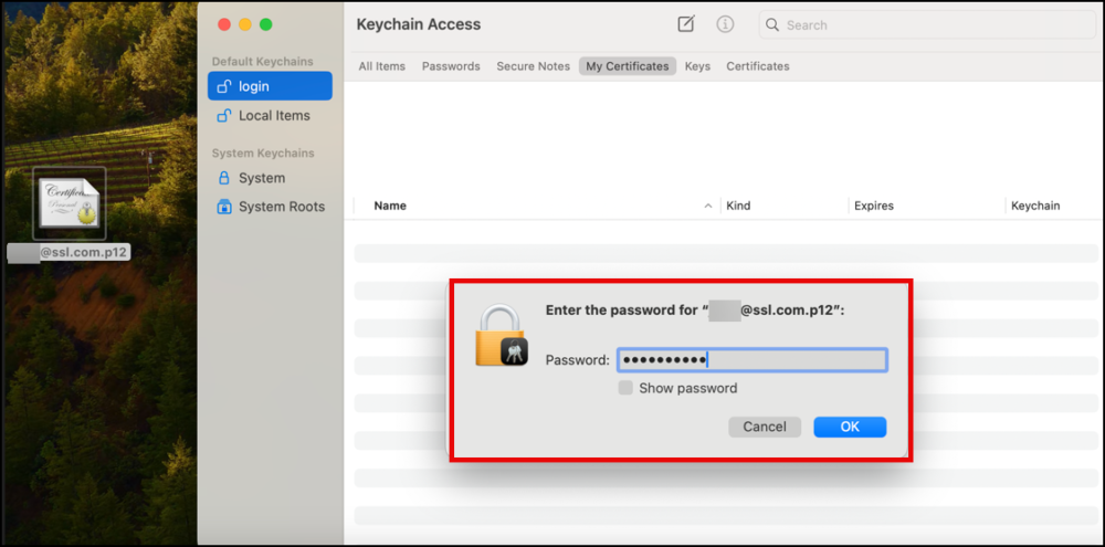 4. Open the Downloads folder of Macbook. Hover to your downloaded certificate file. Drag the file to Keychain Access, specifically the login section. Enter the password of your PFX certificate that you created, when prompted for it.