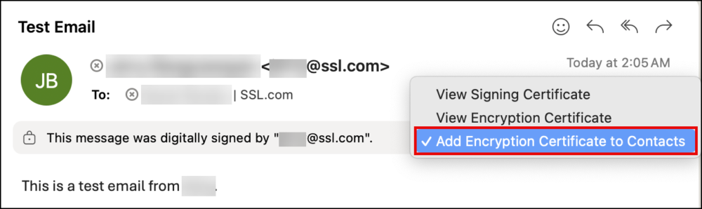 4. Select the option: Add Encryption Certificate to Contacts. You will now have each other’s public key and from here, you will be able to exchange encrypted emails.