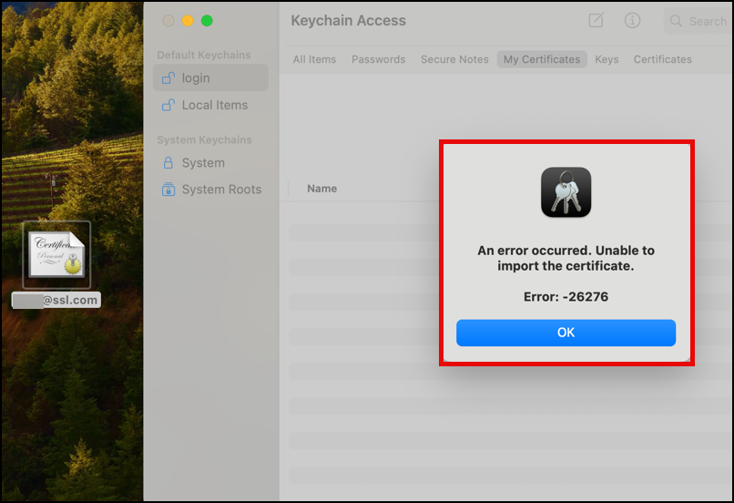 5. If you see this error: An error occurred. Unable to import the certificate. Error:-26276, just press the OK button. This message appears to be a common glitch on at least some versions of macOS, and may appear despite the fact that the PFX was successfully imported.