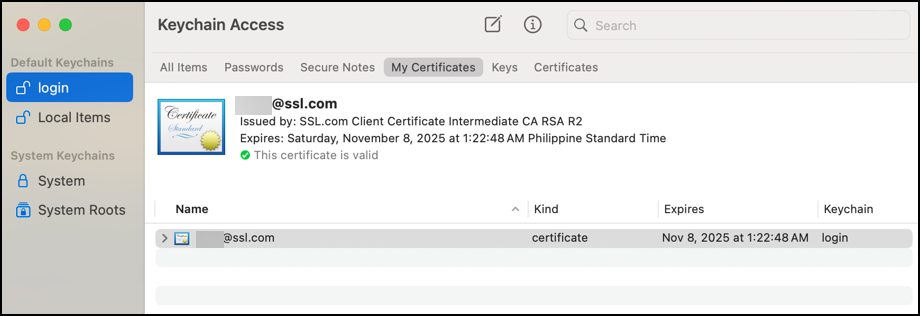 6. The certificate is now installed on your MacBook. Keychain Access will show this description: This certificate is valid. A badge and check mark symbol will also be displayed. You are now ready to use your S/MIME certificate on Outlook.